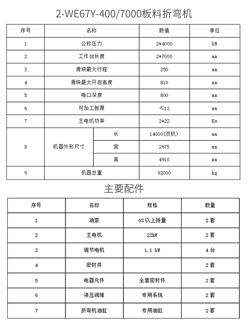 該設(shè)備由兩臺折彎機組成,雙機聯(lián)動實現(xiàn)同步工作.單機由工作臺滑塊以及左右墻板組成,墻板由于設(shè)備運輸原因,采用拼裝式結(jié)構(gòu),機架具有足夠的剛性,兩只油缸分別裝在左右墻板上,由液壓系統(tǒng)在電器操作系統(tǒng)的作用下,驅(qū)動滑塊下行,滑塊上裝有上模,當(dāng)上下模接觸工件后,系統(tǒng)升壓,使工件成型,使用不同的模具,可以在不同的折彎方式下,得到不同形狀的工件.質(zhì)量穩(wěn)定可靠